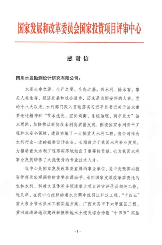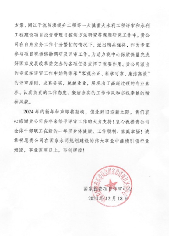 近日,國(guó)家發(fā)展改革委國(guó)家投資項(xiàng)目評(píng)審中心向公司發(fā)來(lái)了感謝信,對(duì)公司作為水利行業(yè)一流的勘察設(shè)計(jì)企業(yè),長(zhǎng)期致力于我國(guó)水利事業(yè)發(fā)展做出的重要貢獻(xiàn)給予高度評(píng)價(jià)。對(duì)公司支持國(guó)家投資項(xiàng)目評(píng)審中心工作表示感謝,并祝愿公司事業(yè)蒸蒸日上,繼續(xù)引領(lǐng)行業(yè)潮流。