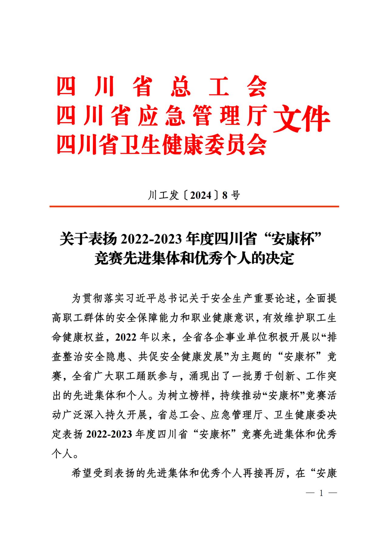近日,四川省總工會、四川省應急管理廳、四川省衛(wèi)生健康委員會聯(lián)合表揚2022—2023年度四川省“安康杯”競賽先進集體和優(yōu)秀個人,公司獲得2022—2023年度四川省“安康杯”競賽先進集體。