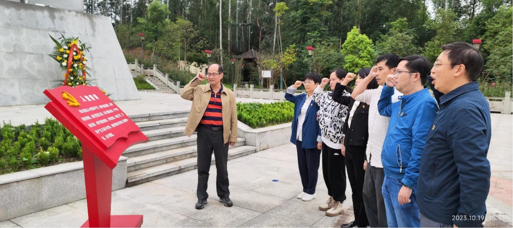 參觀結(jié)束后,一行人來到了青神縣烈士陵園,向西山紅軍武裝起義犧牲的革命烈士獻上我們最誠摯的敬意。在莊嚴肅穆的氛圍中,由機電分院老支部書記周雄同志領誓,全體黨員緊握右手,在烈士陵園“人民英雄永垂不朽”紀念碑前重溫入黨誓詞。
